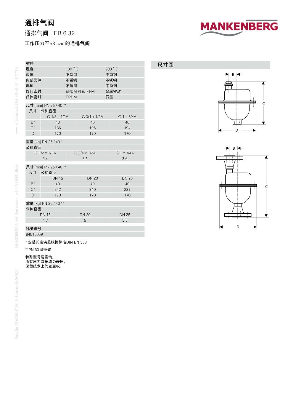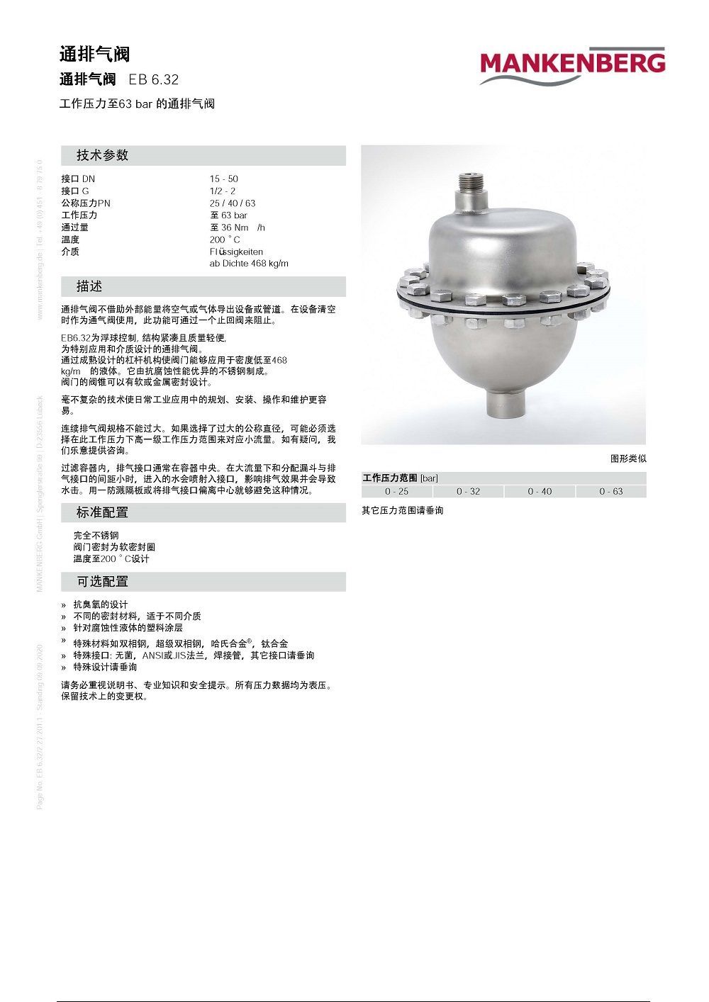 德国Mankenberg 高压排气阀 EB 6.32德国Mankenberg 高压排气阀为浮球控制, 结构紧凑且质量轻便, 为特别应用和介质设计的通排气阀。 通过成熟设计的杠杆机构使阀门能够应用于密度低至468 kg/m³的液体。它由抗腐蚀性能优异的不锈钢制成。